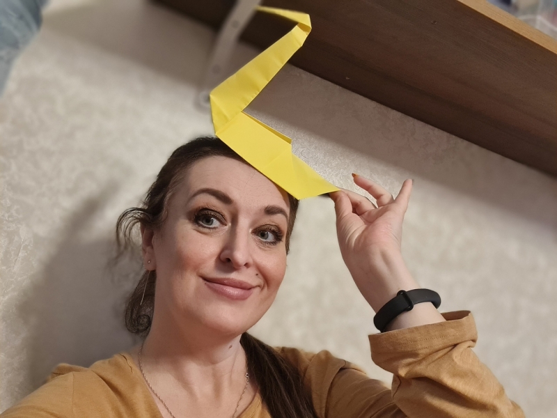 Кира нас сегодня украсила коронами из оригами собственного изготовления.