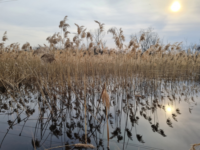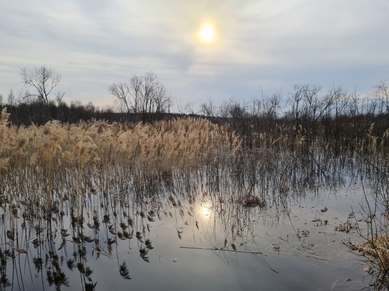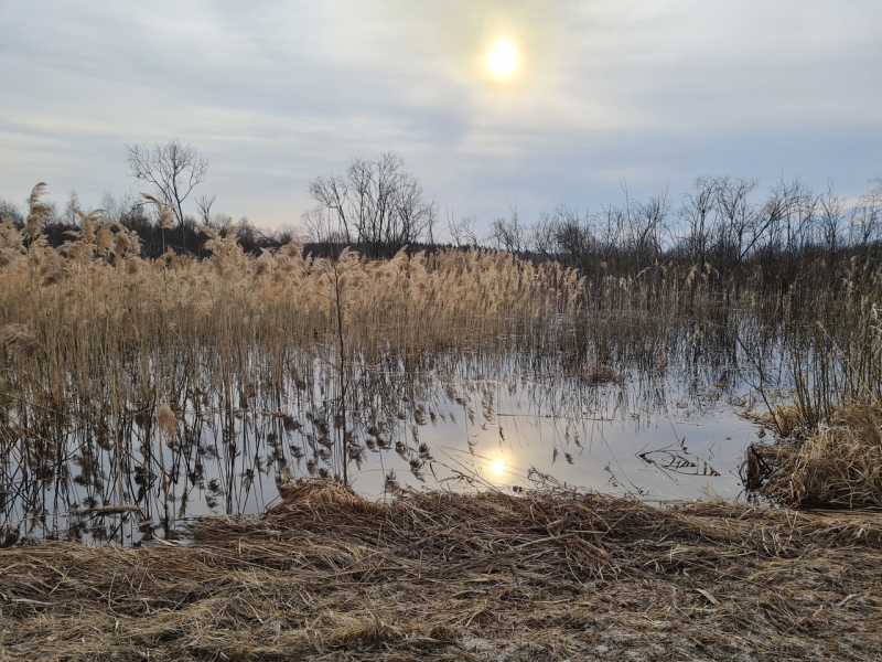 По дороге немного пофотографировала половодье. В такие минуты обязательно нужно выключить мотор у машины и послушать природу. Вроде, тишина, но вокруг множество звуков. Журчит переполненная речка, жужжит первый шмель, бабочки начали играть и, проносясь компанией мимо, шуршат крылышками. Пролетели три большие птицы. Увидели нас и заорали. Наверное, это разведчики. Ищут место, куда привести остальных. Ветер колышет сухую траву и такое впечатление, будто она шепчет. От этого даже становится немного не по себе. Настолько всё наполнено мистикой и фольклором, того и гляди из чистейшей воды, в которой видна каждая травинка, покажется русалка.