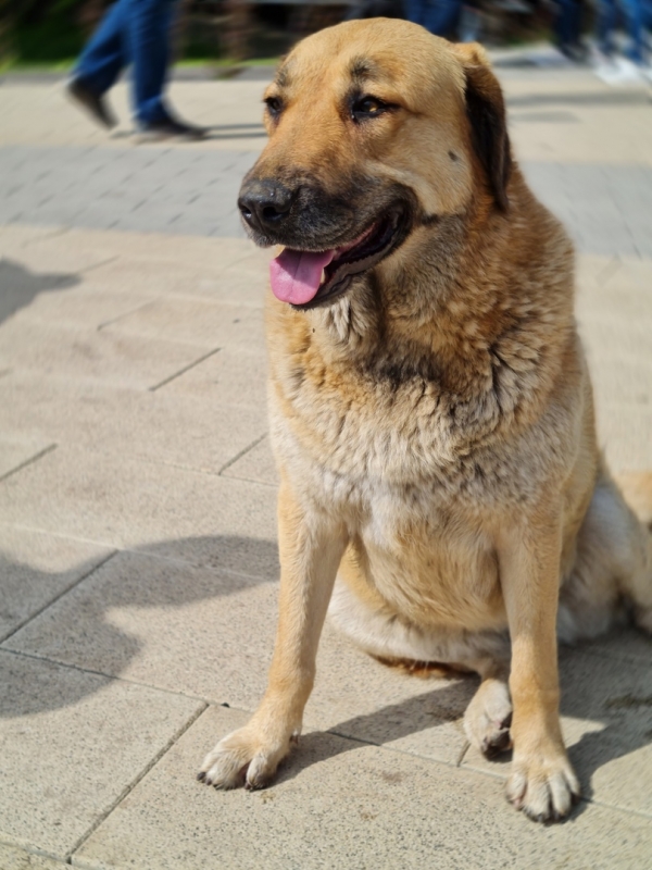 Во время нашего действия, между нами прошла старая полная собака. Она шла тихо, не отклоняясь от курса, будто понимала, что ей всё равно уступят дорогу.