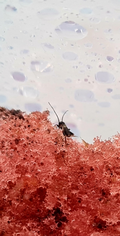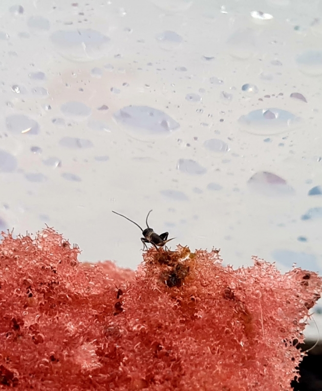 Из жизни наших новорожденных сверчков. Самым трудным оказалось даже их не раздавить, а напоить. Из поилки для больших сверчков они пить не могут - утонут. Нашли выход - распыление капелек на стенки террариума, на губочку и листочки. Бедные так хотели пить, что сразу прибежали, как только попшикали из распылителя. Напомню, что сейчас сверчки размером с блоху.