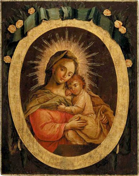 Икона была написана на холсте овальной формы неизвестным художником; некоторые полагают, что образ могли написать два мастера: один – Божию Матерь с Младенцем, другой – венок из красочных и пышных цветов. На Лике Пресвятой Девы – выражение милосердия и любви к страждущим и скорбящим, с верой прибегающим к Ее благодатной помощи и заступничеству.