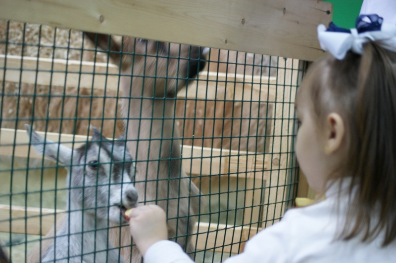 Ну и пусть не было слонов и львов! Зато дети покормили и погладили енотов, ежей. Кстати, в зоопарке находится уникальный вид ежей – ежи альбиносы с красными глазками! Почесали за ушком ослика Зою, барашек, овечек и маленьких козликов. Удалось даже потрогать настоящего дикобраза, который от любого шума «распушал» свои огромные колючки и тут же высовывал из клетки мордочку, выпрашивая морковку или огурчик. Морские свинки и кролики не сходили долго у детей с рук. В центре зала плавали в прудике настоящие рыбки, которые, казалось, тоже хотели пообщаться. Детишки и рыбкам хотели дать морковки и огурчиков, но взрослые успели сказать, что рыбки такое не едят.
