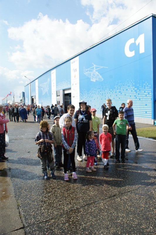 На МАКС мы пошли 29 августа. МАКС нас встретил проливным дождём, промокли мы до нитки. Слава Богу, что в павильоне С 1 находился стенд нашего фонда "Русская Берёза", куда мы и побежали греться. Второй плюс это то, что у сотрудника фонда стояла машина на стоянке P 2 и он поехал к нам домой за сухой одеждой. Пока он ездил, я отогревала Дуську, старшие с нянями пошли гулять по павильонам и насмотрелись много интересного.