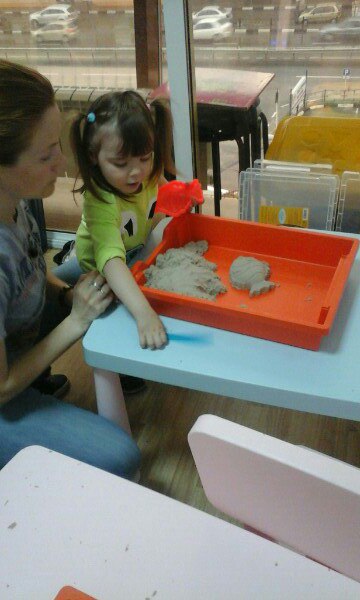Наши девочки Дусенька и Кира начали ходить в центр развития. Посетили первое занятие в студии песка. Мы узнали, что занятия с песком очень полезно детям, у которых были (или есть) тяжелые психологические стрессы. Дусеньке очень понравилось: она усердно строила куличики и рисовала на песке. Кирюша у нас пока трудно воспринимает любые занятия вообще, но тоже увлеклась.