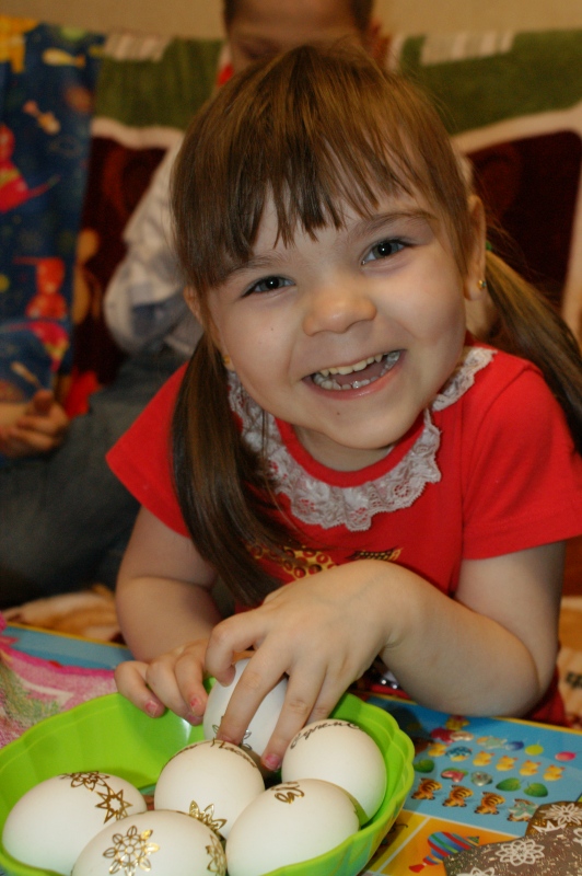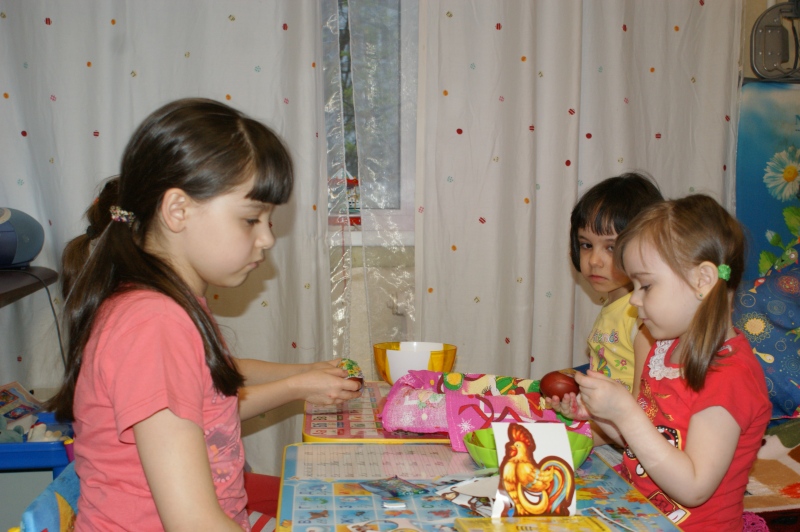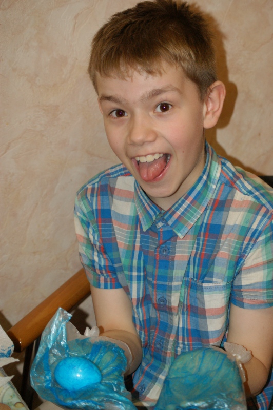 Как всегда, с малышами мы в Чистый Четверг красим яички. Каждый принимает участие, показывает, что сделал. Всё проходит весело и дружно. Яиц на этот раз побили немного))) Накрасили и одели в "одежды" целую корзинку.