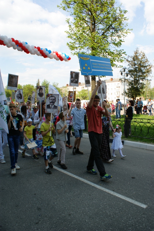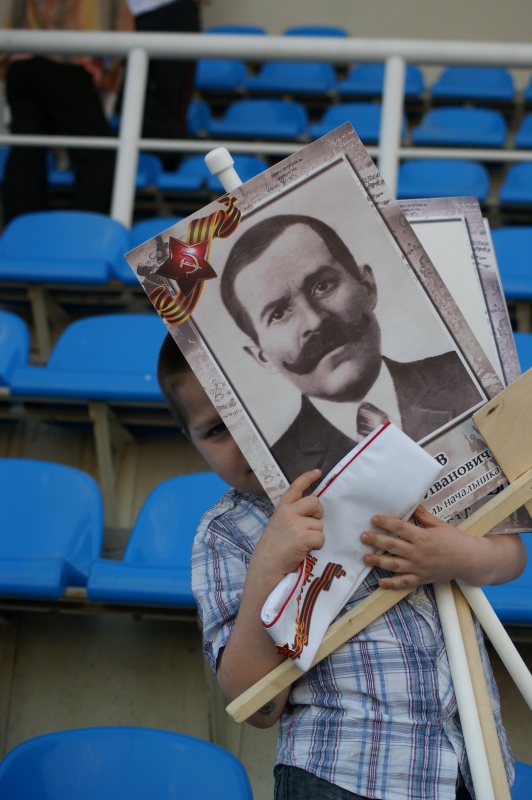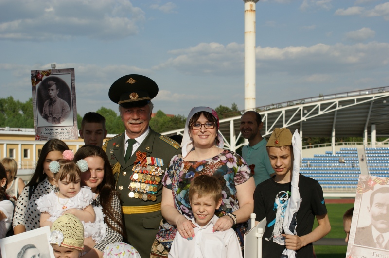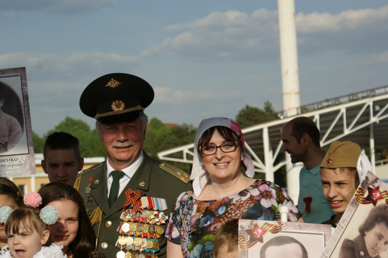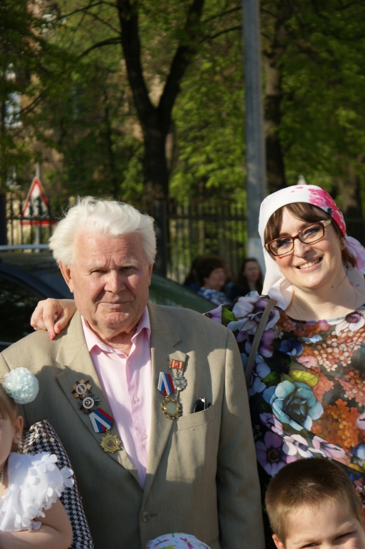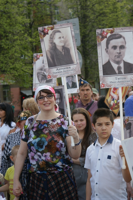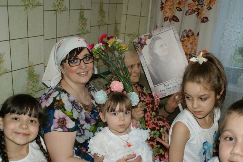 В детстве каждый год я с дедами Павлом и Василием Антонюк отмечала День Победы. У деда Васи в этот день еще был день рождения. Мы всегда ездили с дедой Пашей и бабой Дусей в Раменское в гости к деду Васе и бабе Маше. Дед Паша был очень скромный и никогда не одевал ордена и медали, а дед Вася до нашего приезда ходил куда-то выступал и встречал нас в торжественном виде. Деды садились отмечать праздник, вспоминали каждый своё прожитое... Для них День Победы был святой праздник. Теперь моих дедов нет и бабы Маши тоже. А бабушка Дуся, слава Богу, жива, но в этом году она отказалась выходить из дома из-за плохого самочувствия. Но мне так хочется сохранить память об этом празднике для своих детей. И, когда мы идем с фотографиями своих близких, мы идем не с умершими, а с живыми, мы их помним, молимся о них и, конечно, благодарим за то, что мы сейчас живём. Живём, часто жалуясь на жизнь, отчаиваясь от каких-то мелких неприятностей. Но, когда приходишь к бабушке и она рассказывает о том, как в 15 лет в 41-м оказалась одна, без родителей, в Смоленской Области, как она пережила оккупацию и потом пешком добиралась до Москвы, о том, как родители её встретили живую, будучи уверенными, что бабули нет в живых. О том, как потом трудилась без продыха.... начинаешь ценить то, что дал Бог и становится безумно стыдно. И за свою слабость, и за то, сколько переживаний принесла я своим близким, самым родным людям, с фотографиями которых иду теперь. Как много они понесли потерь. Пережили страшные годы. И до самого последнего своего вздоха они оставались (а бабуля и остается) благородными, честными, преданными своему Отечеству и семье, людьми. Так хочется быть похожей на них. Так хочется, чтобы такими же были мои дети. И родные и приемные. Малыши, конечно, не понимают пока смысла всего мероприятия, но я очень надеюсь, что, теряя со временем Ветеранов, мы сохраним хотя бы частицу того, что они передали нам.