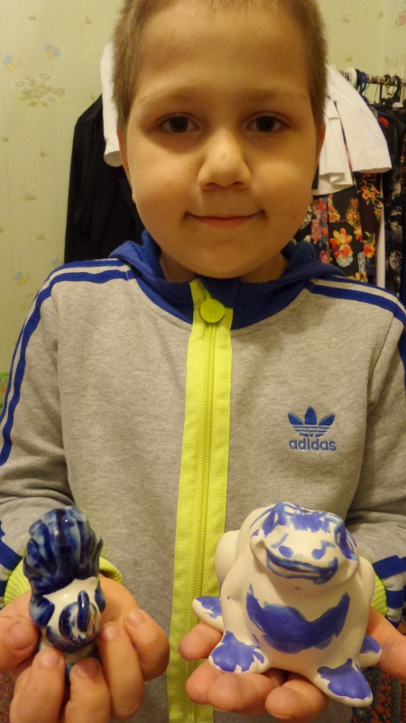 Ромик ездил с классом в Гжель и смотрел, как рождается гжельский расписной фарфор. Мастера дали возможность ребятам самим сотворить изделие. Ромик сделал солонку лягушечку и привёз её маме. Еще он купил маме маленького петушка. Вот так у нас любовь и выражается)))))