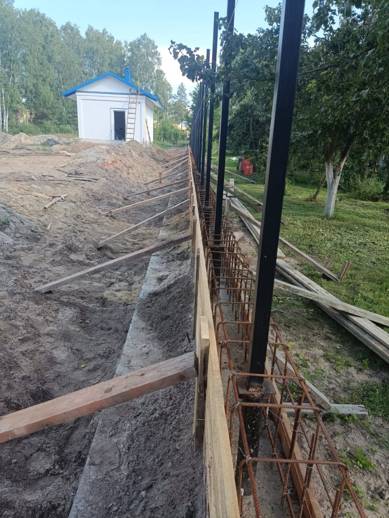 Арматурный пояс готов. Частично площадка обнесена забором.