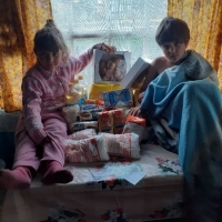 3 октября 2022г. сладости, мягкая игрушка, детская сумочка, ручки, заколки, шарфик, чай, конфеты, шахматы, прокладки, туалетная бумага, стельки, легинсы и платье-халат маме. Отправитель: Ольга