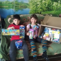 14 ноября 2018г. набор школьника, конструктор, кукла, паровозик, шашки, сладости, иконка, магнит, Евангелие. Отправитель: фонд