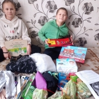 24 декабря 2022г. Посылка с новогодними подарками, одеждой, средствами гигиены и продуктами Отправитель: Добрая воля