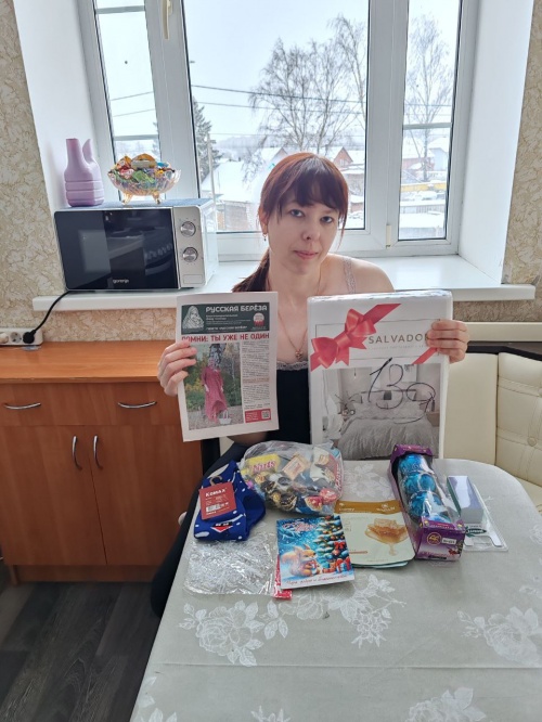 Здравствуйте, уважаемый фонд Русская Берёза и сотрудники фонда. Нам пришли две посылки от вас. Видели бы вы лица детей, как они радовались! Всего так много было: сладкие подарки, куклы для Евочки, шампунь и много чего. Спасибо вам за подарки, мы вам безмерно благодарны, здоровья вам и сил. Спасибо, что вы есть!
