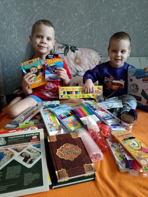 Благодаря группе Отдам Подопечным Фонда, получили посылку т Фонда русская Берёза. В посылке были игрушки из Детского Мира для мальчишек, фломастеры, краски, пластилин, книжечки по возрасту. Игрушками Паша и Рома сразу начали играть. Так же и для меня были сюрпризы, новые наручные часы, пенка для умывания, христианская литература и Любимая Газета Русская Берёза. Спасибо Вам большое за то, что нам помогаете. Храни вас всех Господь.