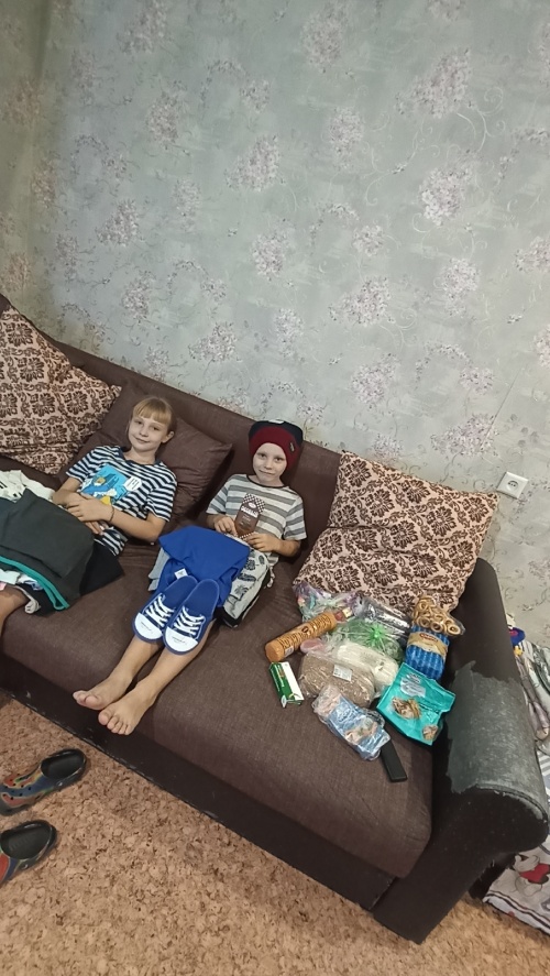 15 сентября 2025г. Посылка: джинсы (неск. шт.), футболки (неск. шт.), кроссовки (2 шт.), конфеты, шоколад, пряники, крупа Отправитель: Благотворитель Татьяна