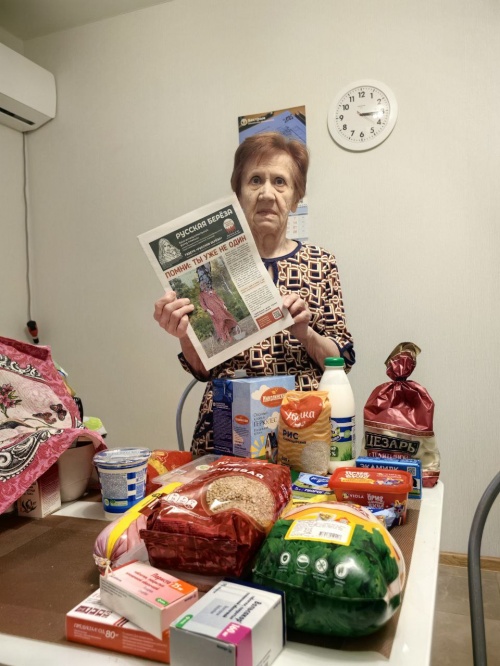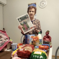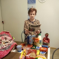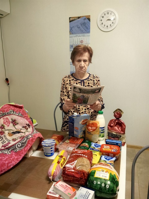 Мы без выходных! На фото Кваченюк Анна, попала в зону боевых действий , вынуждена была переехать . Сама пенсионер, инвалид , и очень тяжело и морально, и финансово. Оказали продуктовую помощь. Это самое главное и всегда на первом месте среди других прошений. Стоит сказать, что ежедневно за продуктами мы ходим по три раза, только вот в праздники небольшая передышка, но все равно может кто- то подойти, поэтому у наших сотрудников нет выходных, и двери Галереи открыты для нуждающихся!